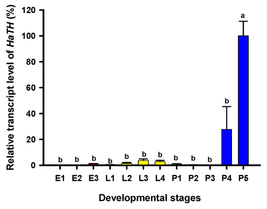 Relative transcript levels of HaTH at different developmental stages of Harmonia axyridis as determined by RT-qPCR. E1, E2, and E3 represent 1-, 2-, and 3-day eggs, respectively; L1, L2, L3, and L4 represent first, second, third, and fourth instar larvae, respectively; P1, P2, P 3, P4, and P5 represent 1-, 2-, 3-, 4-, and 5-day pupae, respectively. Different letters above the standard error bars indicate significant differences based on SPSS (v. 22, IBM Corp. Armonk, NY, USA) followed by One-Way ANOVA (p < 0.05). H. axyridis ribosomal protein 49 (HaRp49) was used as an internal reference gene to normalize the differences among the samples. Relative expression levels for HaTH were calculated based on the highest expressions of HaTH in 5-day pupae (P5) as 100% in the developmental stage.