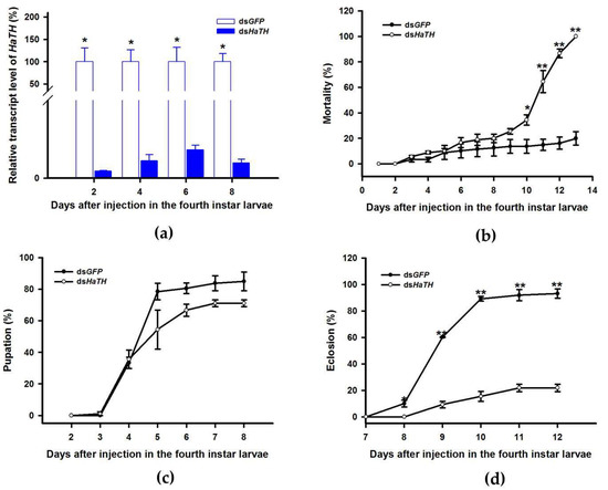 Time-dependent suppression of HaTH transcript in fourth instar larvae of H. axyridis injected with dsHaTH at 300 ng/larva or dsGFP at 300 ng/larva as determined by RT-qPCR (a), time-dependent mortality (b), pupation rate (c), and eclosion rate (d) in dsHaTH and dsGFP-injected larvae. The relative transcription levels (%) are presented as the mean and SE of three replicates with three insects. There were three replicates in the determination of mortality, pupation rate, and emergence rate, each of which had at least 30 fourth instar larvae. Notability analysis was based on SPSS (v. 22, IBM Corp. Armonk, NY, USA) followed by One-Way ANOVA (p < 0.05) within the same time point. Asterisk indicates a significant difference in the rate of eclosion and relative transcript level of HaTH between insect injected with dsHaTH and dsGFP (*: significant difference; **: extremely significant difference).