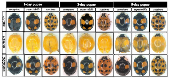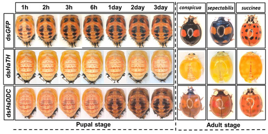 In holometabolous insects, the pupal stage is considered the key material accumulation stage of melanization. To further delimit the critical period of melanin synthesis in H. axyridis, TH and DDC were silenced in 1-, 3-, and 5-day pupae. When the pupae (1-, 3-, and 5-day) were injected with dsHaTH (or dsHaDDC) at 300 ng /pupa, the transcript levels of HaTH (or HaDDC) were significantly suppressed on days 2, 4, and 6 compared to respective controls (Figure 6a–f). For the three subspecies of H. axyridis, 1- and 3-day pupal RNAi targeting TH resulted in complete disappearance of melanin in the overall body. However, when TH was silenced in 5-day pupae, the head and pronotum showed normal melanization with the control, but melanin in the elytra was significantly decreased (Figure 7). We obtained unexpected results with all three subspecies of H. axyridis showing normal melanization in the overall body even though transcript levels of HaDDC were significantly decreased after dsHaDDC injection (Figure 7).