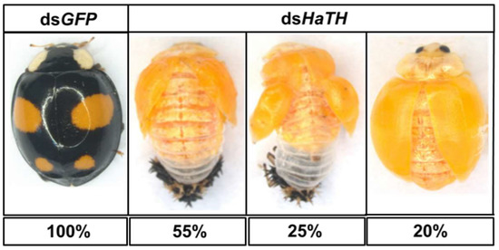 The phenotypes of adult from the pupae of H. axyridis injected with dsHaTH and dsHaDDC, respectively.