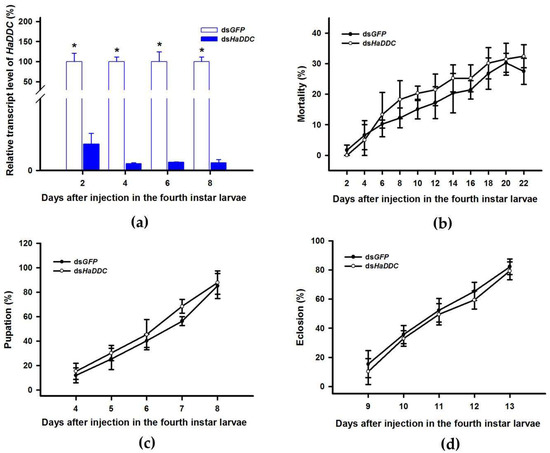 Time-dependent suppression of HaDDC transcript in fourth instar larvae of H. axyridis injected with dsHaDDC at 300 ng/larva or dsGFP at 300 ng/larva as determined by RT-qPCR (a), time-dependent mortality (b), pupation rate (c), and eclosion rate (d) in dsHaTH and dsGFP-injected larvae. The relative transcription levels (%) are presented as the mean and SE of three replicates with three insects. There were three replicates in the determination of mortality, pupation rate, and emergence rate, each of which had at least 30 fourth instar larvae. Notability analysis was based on SPSS (v. 22, IBM Corp. Armonk, NY, USA) followed by One-Way ANOVA (p < 0.05) within the same time point. “*” indicates a significant difference in relative transcript level of HaDDC between insect injected with dsHaDDC and dsGFP.