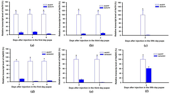 Time-dependent suppression of HaTH (a–c) and HaDDC (d–f) transcript in the 1-, 3-, and 5-day pupae of H. axyridis injected with dsHaTH and dsHaDDC at 300 ng/pupa or dsGFP at 300 ng/pupa as determined by RT-qPCR, respectively. The relative transcription levels (%) are presented as the mean and SE of three replicates with three insects. Notability analysis was based on SPSS (v. 22, IBM Corp. Armonk, NY, USA) followed by One-Way ANOVA (p < 0.05) within the same time point. “*” indicates a significant difference in relative transcript level of HaTH and HaDDC between insect injected with dsHaTH (or dsHaDDC) and dsGFP.