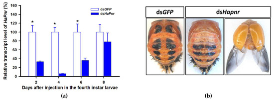 In a recent study, the transcript factor gene Pannier was identified as regulating melanin synthesis during the ontogeny process in H. axyridis [2,3]. To investigate the regulatory mechanism of Pannier on melanin synthesis, we first examined the function of Pannier on development in H. axyridis using RNAi. When fourth instar larvae of H. axyridis were injected with dsHaPnr at 300 ng /larva, transcript levels of HaPnr were significantly suppressed on days 2, 4, 6, and 8 after injection (Figure 8a). The fourth instar larvae of HaPnr that were suppressed successfully pupated, but the pupae showed an abnormal phenotype and melanin was absent from half of the body (Figure 8b). Furthermore, these pupae successfully eclosed into adults, but melanin totally disappeared from the overall body compared to controls (Figure 8b).