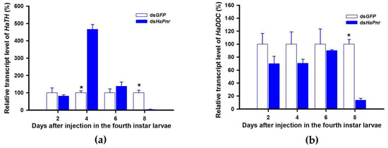 Relative transcript levels of HaTH (a) and HaDDC (b) following dsHaPnr injection in the fourth instar of H. axyridis. The results are presented as the mean and standard errors of three replicates; each was performed with a RNA sample prepared from three insects. Asterisk above the standard error bars indicate significant differences based on SPSS (v. 22, IBM Corp. Armonk, NY, USA) followed by One-Way ANOVA (p < 0.05) within the same time point. “*” indicates a significant difference in relative transcript level of HaTH and HaDDC between insect injected with dsHaPnr and dsGFP.