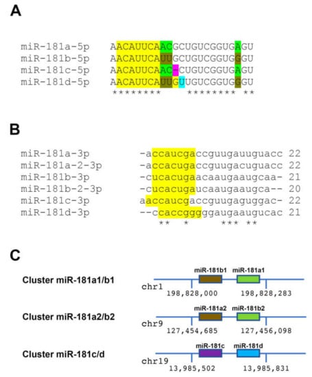 In the human genome, the miR-181 family is composed of four different 5p mature forms, namely (a) miR-181a-5p; (b) miR-181b-5p; (c) miR-181c-5p, and (d) miR-181d-5p (Figure 1A). These four mature miR-181 forms are generated from the following six different precursors (stem-loop) sequences: (a) pre-mir-181a1 and pre-mir-181a2 that give rise to two identical copies of mature miR-181a-5p; (b) pre-mir-181b1 and pre-mir-181b2 that generate two identical copies of mature miR-181b-5p; (c) pre-mir-181c that gives rise to the mature miR-181c-5p, and (d) pre-miR-181d that is processed to form the mature miR-181d-5p. It must be underlined that the above mir-181 precursors can also give rise to six different 3p mature sequences (Figure 1B), whose expression levels are however much lower, but not negligible, with respect to their cognate 5p forms [24]. miR-181 family members are distributed in three independent genomic clusters localized to three separate chromosomes, namely chromosomes 1, 9, and 19 [25] (Figure 1C). In particular, the cluster on chromosome 1 is composed of mir-181a1 and mir-181b1 (less than 100 base pairs (bp) apart) whereas the cluster on chromosome 9 is composed of mir-181a2 and mir-181b2, which are separated by about 1200 bp. Finally, the cluster on chromosome 19 is composed of mir-181c and mir-181d that are about 100 bp apart. The 5p mature forms produced by all these precursors share the same seed region and are therefore predicted to recognize a similar set of target genes (Figure 1A). Outside the seed regions, the four 5p mature sequence show between 1 to 4 base differences, with the pairs miR-181a/miR-181c and miR-181b/miR-181d displaying the highest similarity within each other (Figure 1A). This observation suggests that miR-181c and miR-181d may have derived from a duplication of miR-181a and miR-181b, respectively. On the other hand, the six 3p miR-181 family mature sequences show a higher extent of nucleotide difference with each other, even within the seed region (Figure 1B), and display lower expression levels vs. their related 5p counterpart [24]. Interestingly, despite the higher sequence heterogeneity, the 3p mature sequences show a similar trend of sequence similarity with the paralogs of the miR-181a/c pair being more similar between each other vs. the ones of the miR-181b/d pair.