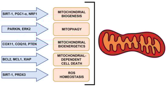 A possible role of the mir-181 family in PD has also been proposed. mir-181a and b are expressed in the Substantia Nigra and striatum [27,129] and were found to modulate the expression of mitochondrial-dependent cell death and autophagy-related genes (i.e., B-cell lymphoma 2 (BCL2), Myeloid Cell Leukemia 1, (MCL1), X-linked inhibitor of apoptosis protein (XIAP), autophagy-related gene (ATG) 5, ATG7) [10,14,15,130]. Moreover, PARK2 (Parkin), responsible for a monogenic form of PD and involved in the regulation of mitochondrial quality control and mitophagy [131], is a miR-181a direct target [37]. Notably, the latter pathways have been linked to PD pathogenesis and progression [132,133,134,135]. Moreover, mitochondrial dysfunction and overproduction of reactive oxygen species (ROS) have been suggested to play a major role in PD pathogenesis, and many genes associated with PD encode proteins that impact on mitochondrial function, clearance and oxidative stress [133]. Interestingly, a direct role of mir-181a and b in mitochondrial biogenesis and function has also been described [28]. Indeed, these two miRNAs control both NRF1 (Nuclear respiratory factor 1) and PPARGC1A (PPARG coactivator 1 alpha, Pgc1a), master regulators of mitochondrial biogenesis, directly and indirectly, respectively. Moreover, mir-181a/b also control Cytochrome c oxidase copper chaperone (COX11) and coenzyme Q10B (COQ10B), which are involved in mitochondrial respiratory chain (MRC) assembly, and peroxiredoxin 3 (PRDX3), an important mitochondrial ROS scavenger [28]. Overall, these data indicate that the mir-181 family plays a pivotal role in mitochondrial function and point to miR-181a/b as possible hubs in the gene pathways underlying mitochondrial homeostasis in both physiological and pathological conditions (Figure 3).