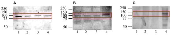 - Laemmli, U.K. Cleavage of structural proteins during the assembly of the head of bacteriophage T4. Nature 1970, 227, 680–685. [Google Scholar] [CrossRef]