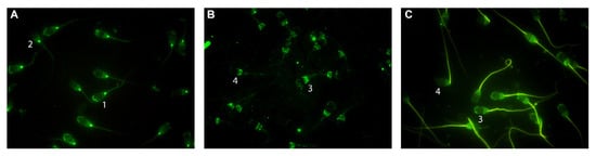 - Harrison, R.A.; Vickers, S.E. Use of fluorescent probes to assess membrane integrity in mammalian spermatozoa. J. Reprod. Fertil. 1990, 88, 343–352. [Google Scholar] [CrossRef]