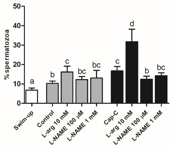 Percentage of live sperm with high nitric oxide levels (PI-/DAF+) assessed by flow cytometry before (swim-up, white bars) and after in vitro capacitation without (control, grey bars) and with cAMP-elevating agents (Cap-C, black bars) and with L-arginine (L-arg, 10 mM) or L-NAME (100 µM or 1 mM). Data are shown as mean ± S.E.M (n = 7). Different letters indicate significant differences (p < 0.05).