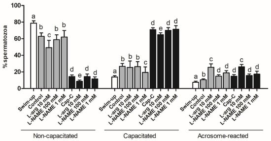 Assessment of capacitation status, evaluated by chlortetracycline(CTC), in ram spermatozoa before (swim-up, white bars) and after in vitro capacitation without (control, grey bars) and with cAMP-elevating agents (Cap-C, black bars) and with L-arginine (L-arg, 10 mM) or L-NAME (100 µM or 1 mM). Data of noncapacitated, capacitated and acrosome-reacted spermatozoa are mean percentages ± S.E.M (n = 8). Different letters within the same group indicate significant differences (p < 0.05).