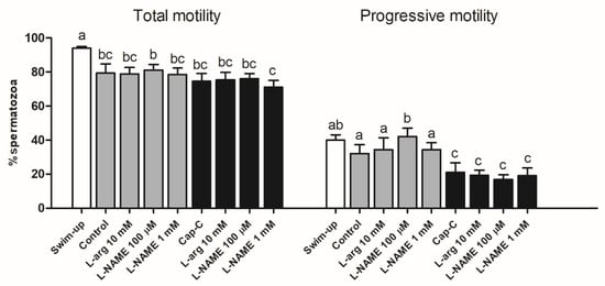 Percentage of total motile (left) and progressive (right) spermatozoa before (swim-up, white bars) and after in vitro capacitation without (control, grey bars) and with cAMP-elevating agents (Cap-C, black bars) and with L-arginine (L-arg, 10 mM) or L-NAME (100 µM or 1 mM). Data are shown as mean ± S.E.M. (n = 5). Different letters indicate significant differences (p < 0.05).