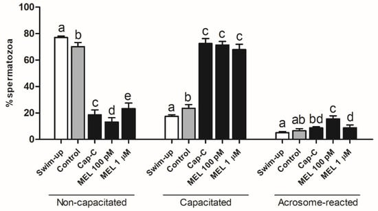 Assessment of capacitation status, evaluated by CTC, in ram spermatozoa before (swim-up, white bars) and after in vitro capacitation without (control, grey bars) and with cAMP-elevating agents (Cap-C, black bars) and with melatonin (MEL, 100 pM or 1 µM). Data of noncapacitated, capacitated and acrosome-reacted spermatozoa are mean percentages ± S.E.M (n = 7). Different letters within the same group indicate significant differences (p < 0.05).