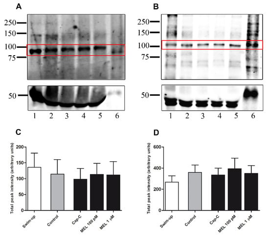 In order to study whether the concentration-dependent effects of melatonin on ram sperm capacitation were mediated by acting on the nitric oxide synthase, we investigated changes in eNOS and nNOS levels by Western blot in capacitated (Cap-C) samples incubated with melatonin at 100 pM and 1 µM (Figure 7A,B). Changes in iNOS were not investigated, given that it was not detected by Western blot. After quantifying NOS bands for each isoform by densitometry, in relation to the α-tubulin loading control (~50kDa), no significant differences were found between samples (Figure 7C,D).