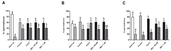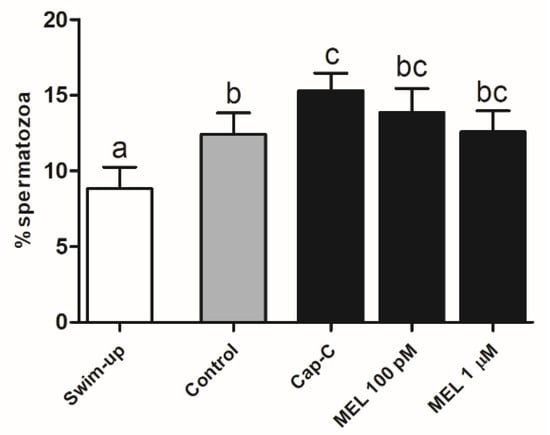 The presence of melatonin did not significantly modify the percentage of live spermatozoa with high nitric oxide levels (PI-/DAF+) compared to the capacitated control sample (Cap-C), although the values obtained were similar to the control sample without cAMP-elevating agents (Figure 9).