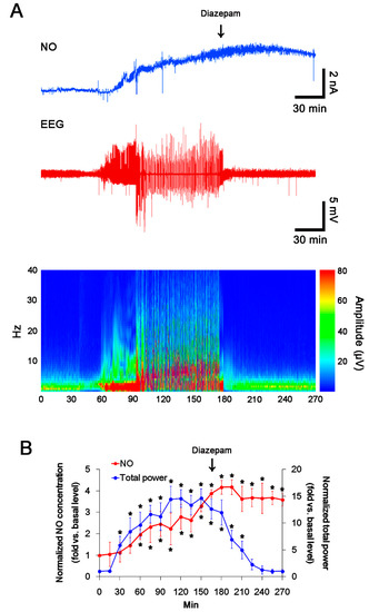 Consistent with our previous studies [21,22], the real-time simultaneous monitoring of NO and EEG revealed seizure onset and increase in NO level ~ 30 and ~ 60 min after PILO injection, respectively (p < 0.05 vs. basal level, repeated-measure one-way analysis of variance (ANOVA), n = 7; Figure 1A,B). NO concentration gradually increased during SE. Diazepam treatment effectively attenuated seizure activity to basal level, while it did not affect NO level (Figure 1A,B). Thus, our findings indicate that prolonged NO synthesis may be initiated by seizure onset, but may not be affected by seizure termination.