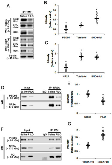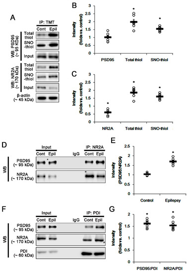 The amounts of total- and SNO-thiols on PSD95 and NR2A, and the bindings of NR2A–PSD95, PDI–PSD95 and PDI–NR2A in the hippocampus of epilepsy rats. (A) Representative Western blot for expression and the amounts of total- and SNO-thiol on PSD95 and NR2A. As compared to control animals, epilepsy rats show the increases in the total- and SNO-thiol levels on PSD95 without altered PSD95 expression. In addition, they show the increases in total- and SNO-thiol levels on NR2A, in spite of the reduced NR2A expression. (B,C) Quantification of Western blot data. Open circles indicate each individual value. Horizontal bars indicate mean value. Error bars indicate SEM (* p < 0.05 vs. saline, Student’s t-test, n = 7, respectively). (D) Co-immunoprecipitation analysis of NR2A–PSD95 interaction in epileptic rats. The NR2A–PSD95 binding is significantly increased, as compared to control animals. (E) Quantification of Western blot data. Open circles indicate each individual value. Horizontal bars indicate mean value. Error bars indicate SEM (* p < 0.05 vs. saline, Student’s t-test, n = 7, respectively). (F) Co-immunoprecipitation analyses of PDI–PSD95 and PDI–NR2A co-assemblies in epileptic rats. The bindings of PDI–PSD95 and PDI–NR2A are elevated in epileptic rats, as compared to control animals. (G) Quantification of Western blot data. Open circles indicate each individual value. Horizontal bars indicate mean value. Error bars indicate SEM (* p < 0.05 vs. saline, Student’s t-test, n = 7, respectively).