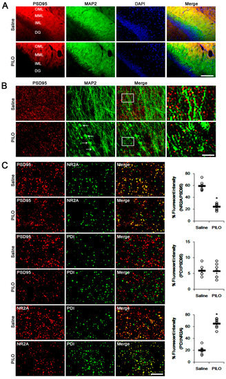 To investigate the effect of seizure activity on PSD95 redox and its S-nitrosylation, we measured total- and SNO-thiol levels on PSD95. PILO significantly reduced PSD95 expression (p < 0.05 vs. saline, Student’s t-test, n = 7; Figure 2A,B). With respect to activity-dependent downregulation of PSD95 expression [4,23], this phenomenon may be one of the adaptive responses for acute seizures. However, PILO increased the number of SNO-thiols, but not total thiols, on PSD95 (p < 0.05 vs. saline, Student’s t-test, n = 7; Figure 2A,B). Consistent with our previous study [5], PILO reduced NR2A expression (p < 0.05 vs. saline, Student’s t-test, n = 7; Figure 2A,C), but elevated the total- and SNO-thiol levels on NR2A (p < 0.05, Student’s t-test, n = 7; Figure 2A,C). PILO inhibited the NR2A–PSD95 binding (p < 0.05 vs. saline, Student’s t-test, n = 7; Figure 2D,E). However, PILO increased the PDI–NR2A binding, but not PDI–PSD95 co-assembly (p < 0.05 vs. saline, Student’s t-test, n = 7; Figure 2F,G). The immunofluorescent study revealed that PILO decreased PSD95 expression in the molecular layer of the dentate gyrus where the dendrites of dentate granule cells are localized (Figure 3A,B). PILO did not affect the colocalization of PDI within PSD95 puncta (Figure 3C). PILO decreased the colocalization of NR2A within PSD95 puncta, but increased colocalization of NR2A within PDI puncta (p < 0.05 vs. saline, Student’s t-test, n = 7, respectively; Figure 3C). Since PDI is a redox-active enzyme for NR2A [5], these findings indicate that PDI may participate in the reduction of disulfide bonds on NR2A, but not on PSD95, following acute seizures. In addition, increased NO concentration may nitrosylate free thiols on PSD95 and NR2A.