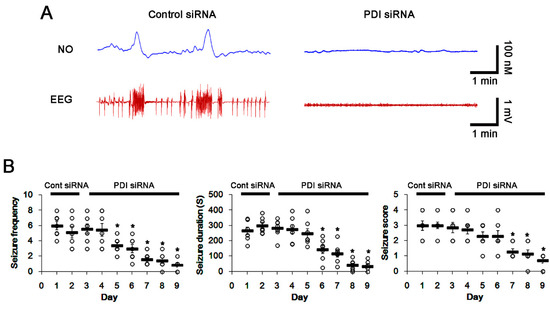 We applied a modified protocol for the effect of PDI knockdown on spontaneous seizure activity in epileptic rats, based on our previous reports [5,42]. Epileptic rats were anesthetized with Isoflurane (3% induction, 1.5%–2% for surgery and 1.5% maintenance in a 65:35 mixture of N2O:O2). A brain infusion kit 1 (Alzet, Cupertino, CA, USA) was implanted into the right lateral ventricle (1 mm posterior; 1.5 mm lateral; 3.5 mm depth from bregma) and connected to an osmotic pump (1007D, Alzet, USA) containing (1) control siRNA and (2) PDI siRNA, respectively. A PDI siRNA sequence corresponding to coding region (5′→3′) is sense: CUGCAAAACUGAAGGCAGAUU, and antisense: UCUGCCUUCAGUUUUGCAGUU. A non-silencing RNA was used as the control siRNA. The osmotic pump was subcutaneously placed in the interscapular region. Some animals were also implanted by monopolar stainless-steel electrode (Plastics One, Roanoke, VA, USA) implanted into the left dorsal hippocampus (3.8 mm posterior; 2.0 mm lateral; 2.6 mm depth from bregma). After baseline seizure activity (control siRNA treatment) was determined over 2 days, PDI siRNA was administered over a 7-day period. Between trials, the minipump was changed out under Isoflurane anesthesia. Every day, each animal was observed by video-EEG monitoring (2 h/day) at the same time. EEG analysis was performed by LabChart Pro v7 (AD Instruments, Bella Vista, New South Wales, Australia). Behavioral seizure severity was evaluated according to Racine′s scale: (1) immobility, eye closure, twitching of vibrissae, sniffing and facial clonus; (2) head nodding associated with more severe facial clonus; (3) clonus of one forelimb; (4) rearing, often accompanied by bilateral forelimb clonus; and (5) rearing with loss of balance and falling accompanied by generalized clonic seizures. After recording, animals were used for Western blot, co-immunoprecipitation, measurements of thiols and S-nitrosylation or immunohistochemistry (see below).