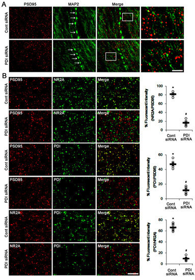 Rats were anesthetized with urethane anesthesia (1.5 g/kg, i.p.) and perfused transcardially with 4% paraformaldehyde in 0.1 M phosphate buffer (PB, pH 7.4). Brains were post-fixed in the same fixative overnight and then cryoprotected and sectioned at 30 μm with a cryostat. Free-floating coronal sections were incubated in PDI antibody in PBS containing 0.3% Triton X-100, overnight, at room temperature. Tissue sections were incubated with a mixture of mouse anti-MAP2 (1:200, #MAB3418, Millipore, Burlington, MA, USA)/rabbit anti-PSD95 (1:500, #ab18258, Abcam, Discovery Drive, Cambridge Biomedical Campus, Cambridge, UK), rabbit anti-NR2A (1:1000, #OPA1-04021, ThermoFisher, Waltham, MA, USA)/mouse anti-PDI (1:1000, #ab2792, Abcam, Discovery Drive, Cambridge Biomedical Campus, Cambridge, UK), rabbit anti-PSD95 (1:500, #ab18258, Abcam, Discovery Drive, Cambridge Biomedical Campus, Cambridge, UK)/mouse anti-PDI (1:1000, #ab2792, Abcam, Discovery Drive, Cambridge Biomedical Campus, Cambridge, UK) or rabbit anti-NR2A (1:1000, #OPA1-04021, ThermoFisher, Waltham, MA, USA)/mouse anti-PSD95 (1:100, #MAB1596, Millipore, Burlington, MA, USA) antibodies in PBS containing 0.3% Triton X-100, overnight, at room temperature. Thereafter, sections were visualized with Cy2- and Cy3-conjugated secondary antibody. Immunoreaction was observed and analyzed, using an Axio Scope microscope (Carl Zeiss Korea, Seoul, South Korea) or a confocal laser scanning microscope (LSM 710, Carl Zeiss Korea, Seoul, South Korea). To establish the specificity of the immunostaining, a negative control test was carried out with pre-immune serum instead of the primary antibody. No immunoreactivity was observed for the negative control in any structures. All experimental procedures in this study were performed under the same conditions and in parallel [5].
