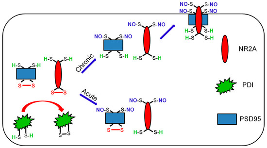 The major findings in the present study are that PDI-mediated reduction of disulfide bonds on PSD95 may play an important role in the ictogenesis by the incorporation of NR2A in epileptic rats, independent of S-nitrosylation of PSD95 (Figure 8).
