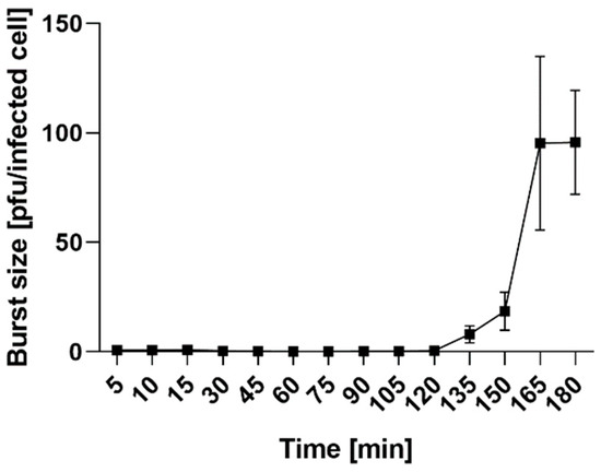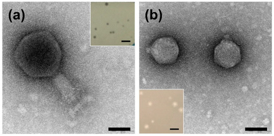 Transmission electron microscopic images of the phage virions were obtained using a TEM LIBRA 120 (Zeiss, Oberkochen, Germany) microscope (HT = 120 kV, LaB6 cathode). Samples were prepared by applying a 10 μL droplet of phage suspension to thin, carbon-coated copper grids (400 mesh), followed by immersing the grids in 1% uranyl acetate for contrasting. Then, the samples were left to dry at room temperature. The visualization of the phages was performed at the Laboratory of Theory and Applications of Electrodes, Faculty of Chemistry, University of Warsaw, Poland.