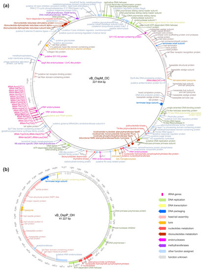 The vB_OspM_OC phage has a large genome; based on the NCBI Genome database as of October 19th 2019, there were 214 phages with genomes over 200 kb, and 137 phages had genomes bigger than vB_OspM_OC. The size of a phage genome above 200 kb is an informal threshold for classifying phages as giant (so called ‘jumbo’) phages. Moreover, the phages within that group are supposed to encode the proteins responsible for DNA replication, nucleotide metabolism, several proteins for host-cell lysis, and paralogous genes encoded across different gene clusters [27,28]. Since vB_OspM_OC possesses most of these features, which are described in detail below, it can be considered a novel representative of the jumbo phages (Figure 2a).