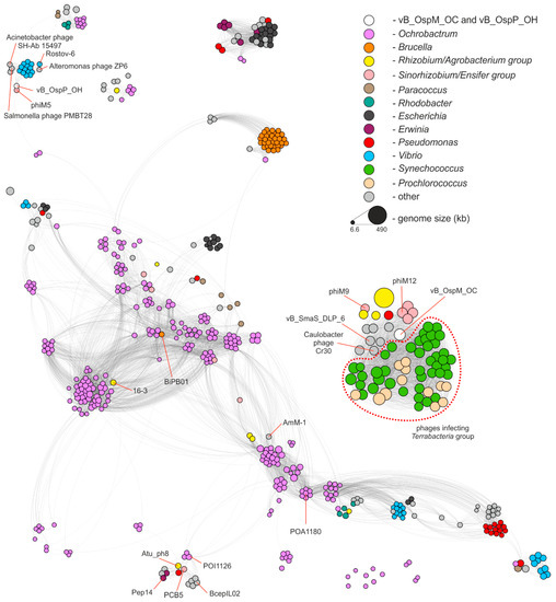 Protein-based similarity network of Ochrobactrum (pro)phages to the other selected phages. Within the network, constructed with vConTACT v2 and visualized in Gephi, each node (575 in total) represents a (pro)phage, and each edge (9622) corresponds to the vConTACT’s degree of similarity between the two phages. The size of the nodes reflects the size of the (pro)phage genome, and its color corresponds to the host genus (if at least five viruses infected by the same genus were included in the network). Nodes representing the vB_OspM_OC and vB_OspP_OH phages are presented in white. If less than five phages were included in the network, they were presented in a joint category called “other”; these were phages infecting Ralstonia, Burkholderia, Stenotrophomonas, Wolbachia, Achromobacter, Sulfitobacter, Pasteurella, Enterobacter, Klebsiella, Shigella, Roseobacter, Salmonella, Rhodovulum, Thiobacimonas, Xantomonas, Pelagibacter, Dinoroseobacter, Mesorhizobium, Cystobacterineae, Alteromonas, Acidithiobacillus, Azospirillum, Alteromonadaceae, Serratia, Delftia, Acinetobacter, Aurantimonas, Enterobacteria, Caulobacter, Acidovorax, and Bradyrhizobium. Additionally, the phages infecting the Terrabacteria group were distinguished with a dotted line.