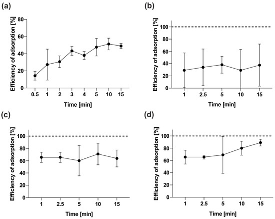 Adsorption efficiency of the vB_OspM_OC and vB_OspP_OH phages. The experiment with an overnight culture of Ochrobactrum sp. POC9 infected by vB_OspP_OH and vB_OspM_OC is shown on panels (a) and (b), respectively. In the case of vB_OspM_OC, tests were also performed using the POC9 cultures with OD600 = 0.2 (c) and OD600 = 0.4 (d). The presented results are the average values from three experiments, with standard deviation represented by the error bars.