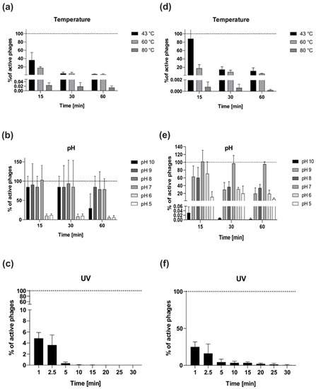 Stability of the vB_OspM_OC (left column) and vB_OspP_OH (right column) phages at various temperatures (a and d, respectively), pH (b and e, respectively), and UV light (c and f, respectively). The presented results are the average values from three experiments, with standard deviation represented by the error bars.
