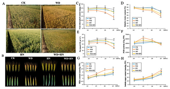 Morphological and physiological parameter changes of bread wheat cultivar Zhongmai 175 under control, water-deficit, high-nitrogen (N) fertilization, and combined treatments. (A) The field performance of wheat from different treatment groups at 25 days post-anthesis (DPA). (B) The performance of spikes and flag leaves. (C–H) Physiological parameter changes. CK: control treatment with regular watering and N fertilization; WD: water deficit treatment with no watering and regular N fertilization; HN: high-N treatment with regular watering and high-N fertilization; WD+HN: combined treatment with no watering and high-N fertilization; MDA, malondialdehyde; Pn, net photosynthesis efficiency; POD, peroxidase. Significant differences compared to the control were calculated based on independent Student’s t-tests: * p < 0.05; ** p < 0.01.