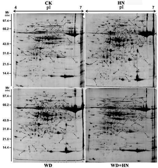 - Chandna, R.; Ahmad, A. Nitrogen stress-induced alterations in the leaf proteome of two wheat varieties grown at different nitrogen levels. Physiol. Mol. Biol. Plants 2015, 21, 19–33. [Google Scholar] [CrossRef][Green Version]