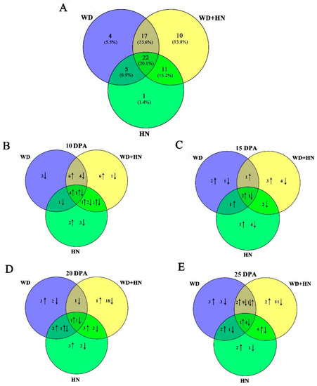 Venn diagrams of 72 differentially accumulated protein (DAP) spots from flag leaves during grain development under water-deficit, high-nitrogen (N) fertilization, and combined treatments. (A) Total DAP spots from wheat flag leaves under different treatments. DAP spots at (B) 10, (C) 15, (D) 20, and (E) 25 days.