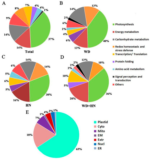 Functional classification and subcellular localization of 72 identified differentially accumulated protein (DAP) spots from wheat flag leaves under water-deficit, high-nitrogen (N) fertilization, and combined treatments. (A) Functional classification of total DAP spots. (B) Functional classification of DAP spots in the water-deficit treatment (WD). (C) Functional classification of DAP spots in the high-N treatment (HN). (D) Functional classification of DAP spots in the combined treatments (WD+HN). (E) Subcellular localization: Chl, chloroplast; Nucl, nuclear; Cyto, cytoplasm; Extr, extracellular; Mito, mitochondria; EM, endomembrane; ER, endoplasmic reticulum.