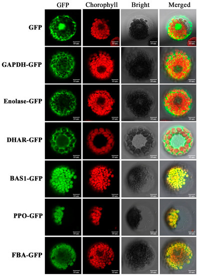 Subcellular localization of selected differentially accumulated proteins (DAPs) by wheat protoplast transformation. GFP: green fluorescent protein signal; Chlorophyll: chlorophyll auto-fluorescence signal; Bright light: bright light field; Merged: combination of GFP, chlorophyll, and bright light. GAPDH, glyceraldehyde 3-phosphate dehydrogenase; DHAR, dehydroascorbate reductase; BAS1, 2-cys peroxiredoxin BAS1; PPO, polyphenol oxidase; FBA, fructose-1,6-bisphosphate aldolase; GFP, negative control.