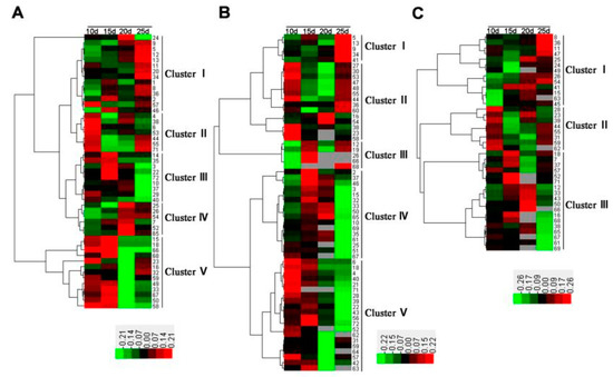 Hierarchical cluster analysis was performed to visualize dynamic expression changes in the identified DAPs. Three hierarchical clusters corresponding to the water-deficit, high-N fertilizer, and combined treatments were constructed using the Euclidean distance method over a complete linkage dissimilarity matrix (Figure 6). In total, 13 expression clusters were classified among 72 DAP spots, including five (clusters I–V) in both the water-deficit (Figure 6A) and high-N-fertilizer groups (Figure 6B), and three (clusters I–III) in the combined treatment group (Figure 6C).
