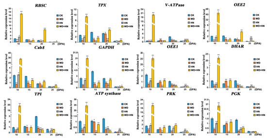 Transcription expression patterns of the genes of 12 representative differentially accumulated proteins from wheat flag leaves during grain development by quantitative real-time PCR analysis. CK: regular watering and N fertilization; WD: no watering and regular N fertilization; HN: regular watering and high-N fertilization; WD+HN: no watering and high-N fertilization; DPA, days post-anthesis. For gene abbreviations, see the main text. Significant differences compared to the control were calculated based on independent Student’s t-test: * p < 0.05; ** p < 0.01.