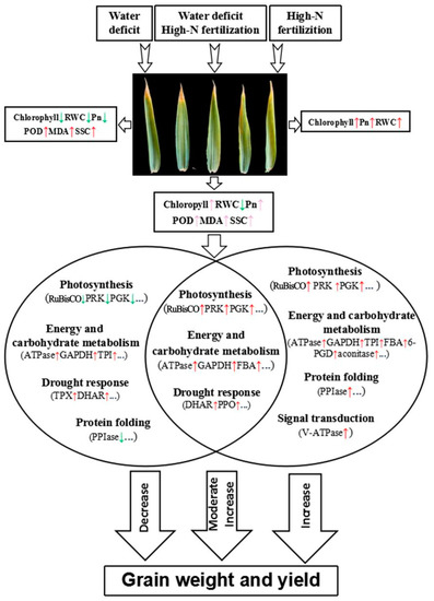 We propose a putative synergistic response network in wheat flag leaf proteomes to water-deficit and high-N conditions (Figure 8). When subjected to water-deficit and/or high-N fertilization, a series of physiological changes occurred in flag leaves, including a significant reduction in RWC, total chlorophyll content, Pn caused by drought stress, and a significant increase in these same parameters under high-N application. A moderate promotion of these parameters was observed under the combined treatment. Stress-related parameters, MDA, POD activity, and soluble sugar content were increased under the water-deficit and combined treatments. The main DAPs involved in photosynthesis and protein folding were upregulated and downregulated under water-deficit and high-N conditions, respectively. In the combined treatment, DAPs associated with photosynthesis and energy and carbohydrate metabolism showed a moderate upregulation. Ultimately, these physiological and proteomic synergistic responses of wheat flag leaves led to significant changes in grain weight and yield among the water-deficit, high-N, and combined treatments.