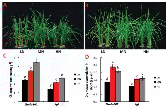 Figure 1. Effect of 20-day nitrogen treatments at sixth leaf stage on the growth of Zhefu802 (A) and Fgl (B), and chlorophyll content (C), dry matter accumulation (D). LN, low nitrogen, 10 mg L−1; MN, moderate nitrogen, 40 mg L−1; HN, high nitrogen, 160 mg L−1. Different letters denote significant difference as determined by LSD test (p < 0.05, n = 3).