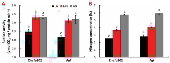 Activity of Rubisco enzyme was substantially inhibited by LN compared with MN in both cultivars. However, no significant difference was observed between MN and HN for both cultivars (Figure 3A). The N content in the leaf significantly increased with increased N treatment concentration in both cultivars. Increases of about 35% and 45% relative to LN were measured in Zhefu802 with MN and HN treatments, respectively, with 32% and 42% increases in Fgl (Figure 3B).