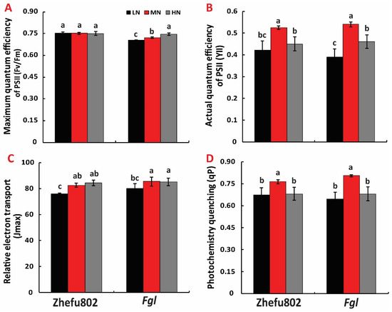 No significant difference was observed in Fv/Fm among the three N treatments in Zhefu802, but significant differences were observed in Fgl. The HN resulted in the highest Fv/Fm, followed by MN, and LN was the lowest (Figure 4A). The MN resulted in a significantly higher YII than LN and HN in both cultivars. No significant difference was observed in YII between LN and HN in Zhefu802, while in Fgl, LN significantly decreased the YII when compared to the HN treatment (Figure 4B). Measurement of the maximum electron transport rate (Jmax) revealed that LN significantly decreased the Jmax compared to the MN and HN treatments for both cultivars (Figure 4C). However, MN showed a significantly higher qP than LN and HN in both cultivars (Figure 4D).