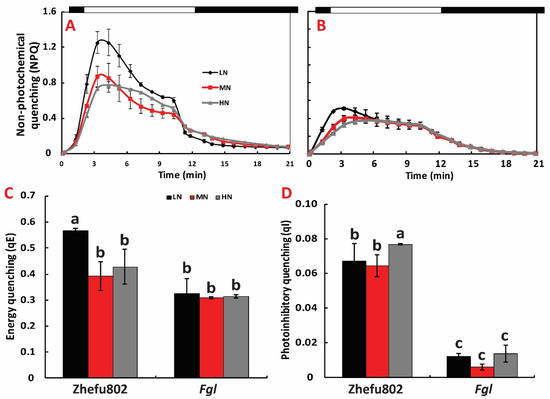 Figure 5. NPQ induction and relaxation analysis of two rice cultivars under different nitrogen treatments. (A) NPQ induction of Zhefu802, (B) NPQ induction of Fgl, (C) energy quenching(qE), (D) photoinhibitory quenching (qI). LN, low nitrogen, 10 mg L−1; MN, moderate nitrogen, 40 mg L−1; HN, high nitrogen, 160 mg L−1. Different letters denote significant difference as determined by LSD test (p < 0.05, n = 3).