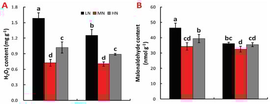 Figure 6. Effect of N treatment on H2O2 content (A) and malonaldehyde content (B) in leaf. LN, low nitrogen, 10 mg L−1; MN, moderate nitrogen, 40 mg L−1; HN, high nitrogen, 160 mg L−1. Different letters denote significant difference as determined by LSD test (p < 0.05, n = 3).