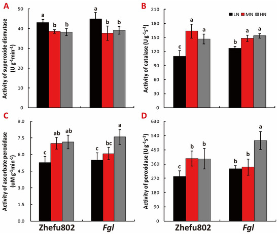 LN significantly increased the superoxide dismutase (SOD) activity in both cultivars compared with the MN treatment, with no significant difference between HM and MN treatment (Figure 7A). However, LN significantly deceased the catalase (CAT) activity in both cultivars compared to MN treatment, while no significant difference between HM and MN treatment was determined. Lower CAT activity in Zhefu802 was observed compared to that in Fgl under LN treatment (Figure 7B). Figure 7C showed significant decrease of peroxidase (POD) activity in Zhefu802 under LN treatment compared with the MN and HN treatments. In Fgl, HN significantly promoted POD activity compared with the LN and MN treatments. The ascorbate peroxidase (APX) activity showed the same trend as POD activity in Zhefu802, with significant suppression by LN of APX activity, and in Fgl, HN significantly increased APX activity (Figure 7D).