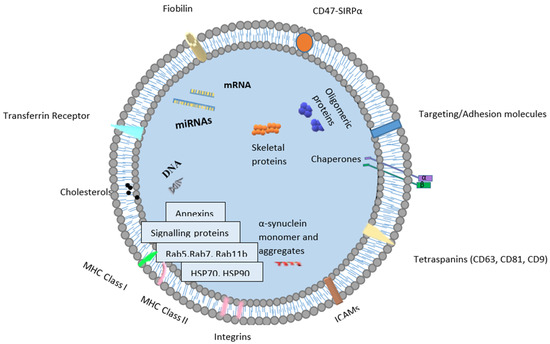 Exosomes are small (from 30 to 120 nm in diameter) extracellular vesicles (EVs) (Figure 1). Their lipid bilayer membrane, with a width of 5 nm, protects them from the negative action of RNases and proteases. Exosomes have a longer retention in circulation in comparison to polymersomes or liposomes [14]. This characteristic originates from transmembrane protein (CD47-SIRPα), which prevents exosomes from being phagocytosed [15]. Moreover, the double membrane structures contain various cargo, such as miRNAs, proteins (e.g., tetraspanin CD63, CD81, CD82, CD53 and CD37, as well as cystolic proteins), lipids (e.g., sphingomyelin, cholesterol and generally saturated fats) and viral particles [16], and their presence depends on the origin cells and organism’s health conditions. The proteins in exosomes include endosomal, plasma and nuclear proteins [17]. Therefore, in comparison to cellular proteins in prostate cancer, those in exosomes have a higher level of glycosylation [18]. Moreover, proteins enriched in exosomes include those relevant for individual exosomal biogenesis pathways and for exosome secretion. The Minimal Information for Studies of Extracellular Vesicles 2018 highlights three categories of markers that must be found in isolated extracellular exosomes. They include at least one transmembrane/lipidbound protein or cytosolic protein and one negative protein marker [19]. The cargo present in extracellular vesicles can be transferred and alter signaling pathways in recipient cells [13]. For example, exosomes from metastatic prostate cancer cells showed high contents of miR-21 and miR-141, which are responsible for the regulation of osteoclastogenesis and osteoblastogenesis. Cancer-derived exosomes can promote epithelial–mesenchymal transition (EMT) via miRNAs. They play an important role in the conversion from benign to malignant cancers [13] and in the regulation of the response to docetaxel, such as miR-34 in prostate cancer cells and cell-derived exosomes targeting Bcl-2. This shows the great influence of extracellular vesicles on the drug resistance of prostate cancer cells.