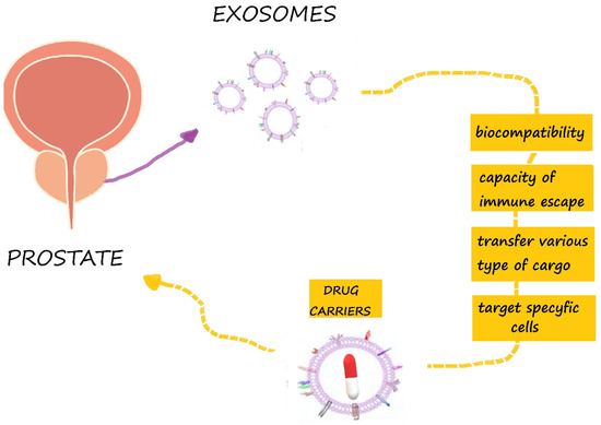 Prostate cancer (PCa) is the second most common cause of cancer-related mortality among men in the developed world. Conventional anti-PCa therapies are not effective for patients with advanced and/or metastatic disease. In most cases, cancer therapies fail due to an incomplete depletion of tumor cells, resulting in tumor relapse. Exosomes are involved in tumor progression, promoting the angiogenesis and migration of tumor cells during metastasis. These structures contribute to the dissemination of pathogenic agents through interaction with recipient cells. Exosomes may deliver molecules that are able to induce the transdifferentiation process, known as “epithelial to mesenchymal transition”. The composition of exosomes and the associated possibilities of interacting with cells make exosomes multifaceted regulators of cancer development. Extracellular vesicles have biophysical properties, such as stability, biocompatibility, permeability, low toxicity and low immunogenicity, which are key for the successful development of an innovative drug delivery system. They have an enhanced circulation stability and bio-barrier permeation ability, and they can therefore be used as effective chemotherapeutic carriers to improve the regulation of target tissues and organs. Exosomes have the capacity to deliver different types of cargo and to target specific cells. Chemotherapeutics, natural products and RNA have been encapsulated for the treatment of prostate cancers.