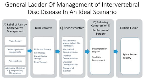 Lower back pain remains the most important musculoskeletal condition affecting the quality of life over the past few decades [1]. Up to 84% of the population have back pain at some point in their lives [2]. Some of the most common causes of lower back pain are intervertebral disc (IVD) diseases and their associated pathologies. IVD can affect both the young and old population [3,4]. Treatment strategies need to consider age of presentation, comorbidities, severity of IVD, neural elements compression and stability of the spinal column. It is a complex algorithm of management, with confounding factors contributing to success in the management of symptoms. It is in the authors’ opinion that the general stepwise invasiveness ladder of management in the treatment of IVD diseases is the relief of pain by conservative management, restorative, reconstructive, replacement, and finally rigid fusion (Figure 1). There is robust interest in clinical and basic science research of different treatment strategies of IVD management. Many of the restorative and reconstructive management strategies are still at the early stages of laboratory experimental and animal trials, with clinical efficacy yet to be proven. That is despite the fact that the prevalence of disc degeneration was found in at least one lumbar level in 35% of subjects between 20 and 39 years of age and all subjects 60 to 80 years of age showed disc degeneration in a study done by Boden et al. [5]. Degenerative disc disease (DDD) and prolapsed intervertebral disc (PID) are the two commonest forms of IVD diseases. They have a close cause and effect relationship as a prolapsed intervertebral disc is a risk factor of degenerative disc disease while advanced degenerative disc often presents with disc prolapse with annular fissure due to degeneration leading to a fragmented disc being prolapsed into the spinal canal [6]. There are a number of studies and reviews on specific arms of diagnostic and treatment strategies in intervertebral disc diseases. However, there is a paucity of literature giving a broad summary of the interplay in these developments of the diagnostic and treatment strategies. This review’s goal is to provide a broad overview of the various issues in intervertebral disc diseases with the proposed treatment strategies and a categorization of the various developments in the management of intervertebral disc diseases.