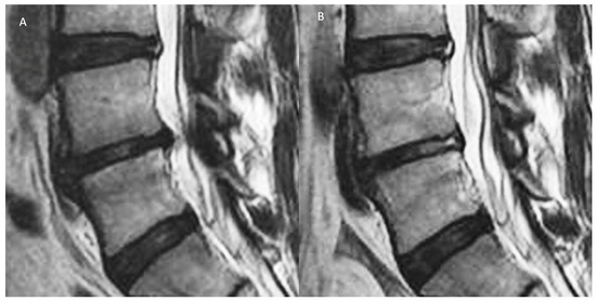 A: Degenerative disc disease with Pfirrmann grade III disc showing an inhomogeneous structure, and an unclear distinction of nucleus and annulus and type 1 Modic changes with intermediate signal intensity in the T2 image with slightly decreased disc height and disc bulge. B: After radiofrequency ablation of the disc, sinuvertebral nerve, and basivertebral nerve, there is shrinkage of the degenerative disc and there is an increase in the signal of Modic changes in the adjacent vertebra body. However, with the current imaging technique, there are limitations in quantifying the effects of these end plate changes objectively. Further development in this area of assessment would be beneficial to assess treatment effects on the end plate and disc in early DDD (figure reproduced with permission courtesy of Kim et al. [12]).