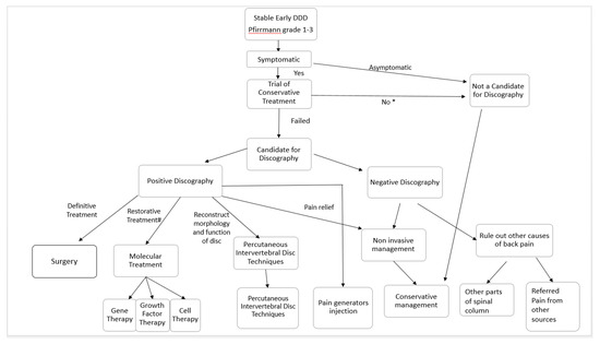 Decision flow chart in clinical practice for patients with stable early degenerative disc disease. Patients with early DDD manifested as Pfirmann grade 1–3 disc on MRI are assessed for symptoms. Asymptomatic patients and symptomatic patients who have not tried conservative management (*) should undergo a trial of conservative management first. Patients with persistent discogenic pain who failed conservative treatments can be considered for discography. A negative discography makes disc-related symptoms less likely. One should consider ruling out other causes of back pain related to the spinal column, such as facet joint pain, tumor, infection, and fracture, etc., or referred pain from other visceral organs, or musculoskeletal back pain. A positive discography is suggestive of disc-related symptoms. This group of patients are consulted for options of invasive or noninvasive treatment strategies. A noninvasive conservative management option for pain relief consists of physiotherapy, oral medications, exercises, and alternative medicine. Invasive options include pain relief by pain generator injections. Injection of steroid and local anesthesia can be applied to pain generators, such as facet block to the facet joint, epidural steroid injection to the epidural space, and peri radicular injections for neuropathy or percutaneous epidural neurolysis when adhesion between the dura and intervertebral disc diseases is observed. Reconstruction of disc morphology, with percutaneous intervertebral disc techniques, such as mechanical, chemical, and thermal decompression and biomaterial injection, is another option. Many of these therapies are still in experimental stages. Restorative treatment, such as molecular treatment, such as gene, growth factor, and cell therapy, is another option, but most of these therapies are still at the clinical trial stages. Surgery is often the last definitive treatment option if other conservative treatment strategies fail.