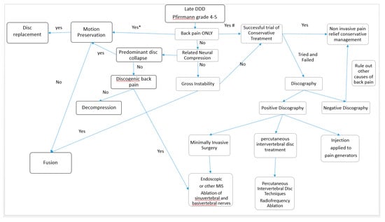 When a patient presents with lower back pain, it is important to correlate clinical symptoms with imaging. If symptoms are not concordant with the imaging modality, interventional treatment may not yield the benefits desired. In fact, there is a limited correlation of disability with the degree of disc degeneration in the MRI findings of several studies [49,50]. A trial of conservative management, such as physiotherapy, oral analgesia, and supplements with or without alternative medicine, would help in some patients with DDD. However, the recurrence of lower back pain is common when ignored [51]. The recent developments in imaging and inflammatory markers may help in decision making in the near future. Provocative discography was the gold standard provocative test for degenerative disc disease. However, it is not a routine practice performed in all degenerative disc disease as it is an invasive procedure with inherent risks, such as infection and neural injuries [46]. The patient can consider provocative discography when there are significant symptoms despite being compliant to conservative management. When there is concordant pain with discography, a decision can be made based on (1) early versus late stage of DDD, (2) stability of the spinal column, (3) status of neural compression, and (4) predominant symptoms. A summary of the proposed treatment algorithm for early DDD and late DDD is shown in Figure 3 and Figure 4. The details of these treatment strategies are discussed in the following discussion.