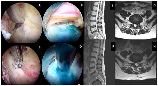 - Lee, C.H.; Choi, M.; Ryu, D.S.; Choi, I.; Kim, C.H.; Kim, H.S.; Sohn, M.J. Efficacy and safety of full-endoscopic decompression via interlaminar approach for central or lateral recess spinal stenosis of the lumbar spine: A meta-analysis. Spine (Phila Pa 1976) 2018, 43, 1756–1764. [Google Scholar] [CrossRef]